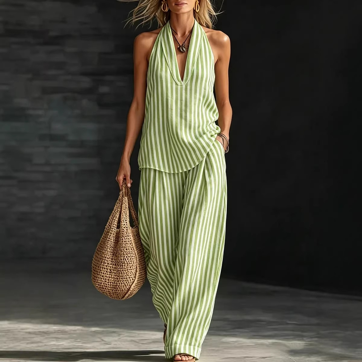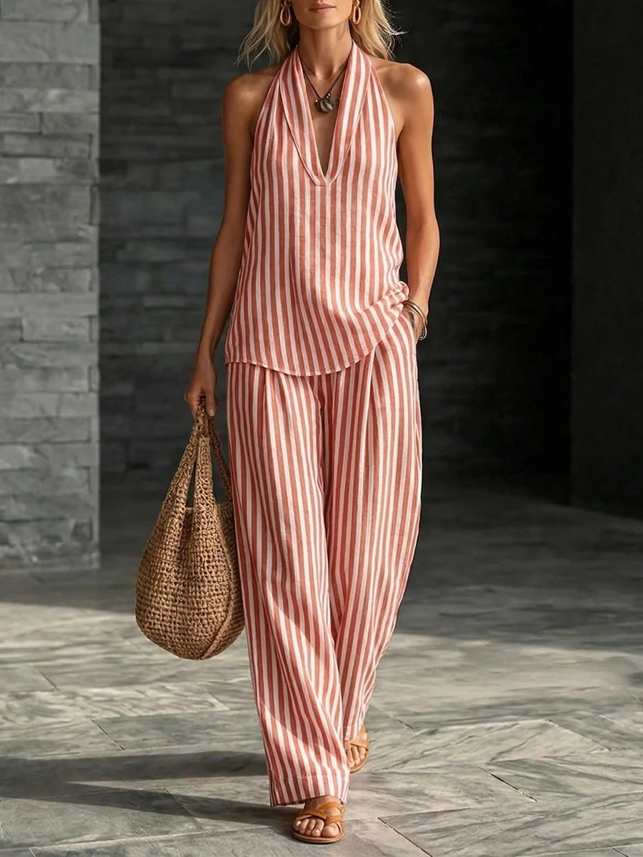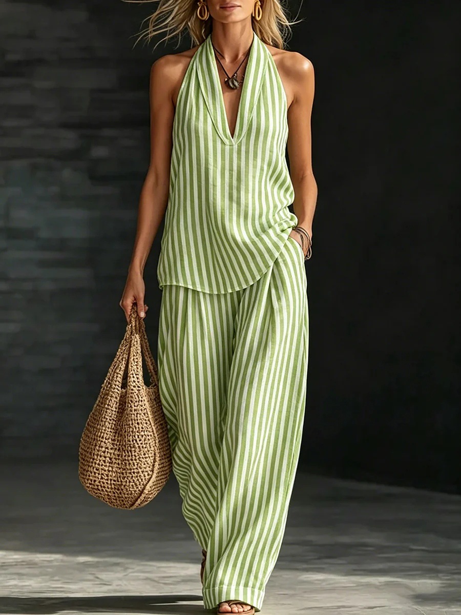 Striped Wide-leg Pants Womens Fashionable Two-piece Set